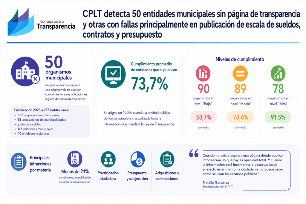 50 organismos municipales del país operan sin siquiera una página web en que den cumplimiento a sus obligaciones legales de transparencia activa, según detectó el Consejo para la Transparencia (CPLT) en su más reciente fiscalización correspondiente al período 2025 a organismos vinculados a municipios. Específicamente se revisó el nivel de cumplimiento de 257 instituciones: corporaciones municipales (181), asociaciones de municipalidades y junta de alcaldes (58), fundaciones municipales (8) y entidades regionales (10).