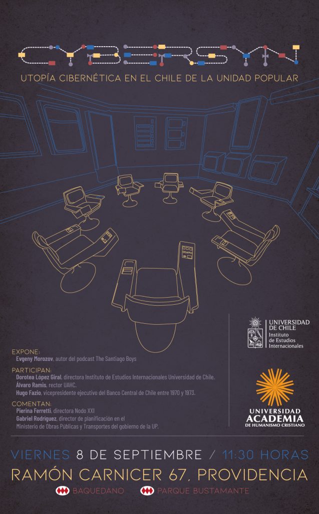 Evgeny Morozov, escritor, investigador bielorruso y académico en la Universidad de Stanford abordará las implicaciones políticas y sociales del proyecto tecnológico Cybersyn implementado durante la Unidad Popular en una conferencia organizada por la Universidad Academia de Humanismo Cristiano y la Universidad de Chile. En ella se referirá a la iniciativa que planteaba un sistema de redes de teletipo para organizar los servicios del Estado en lo que se conoce hoy como una internet primitiva, pero que quedó truncada luego del golpe de Estado de 1973.