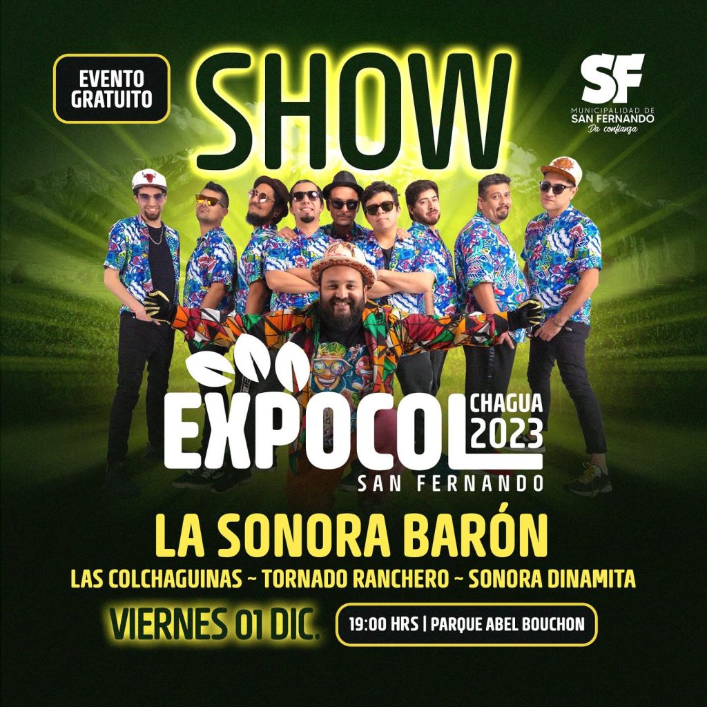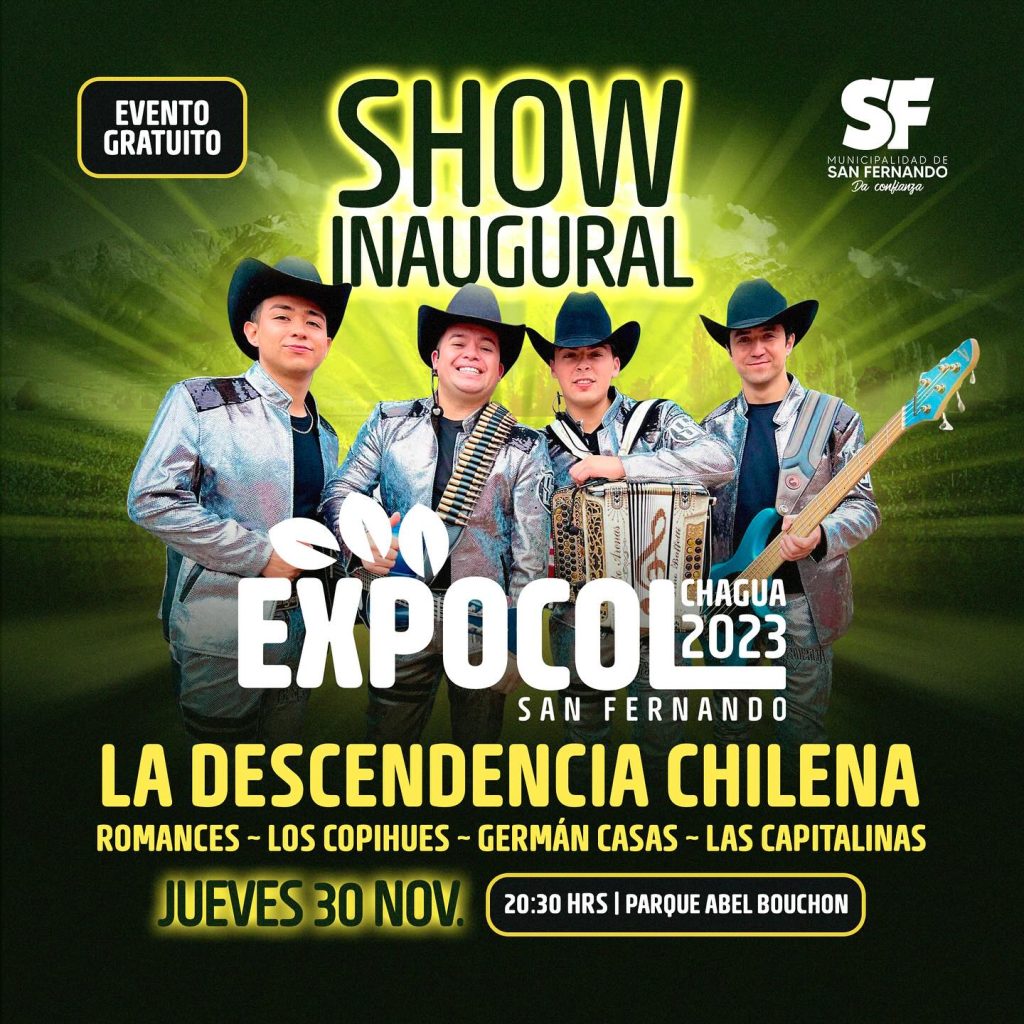 En relación al show musical, Expocol 2023 ofrecerá un espectáculo de primer nivel donde se presentarán, entre otros artistas, María José Quintanilla, Sonora Barón, Sonora Dinamita, La Descendencia Chilena, Grupo León, Las Capitalinas, Cumbia Hits y el histórico vocalista de Los Ramblers, Germán Casas.
