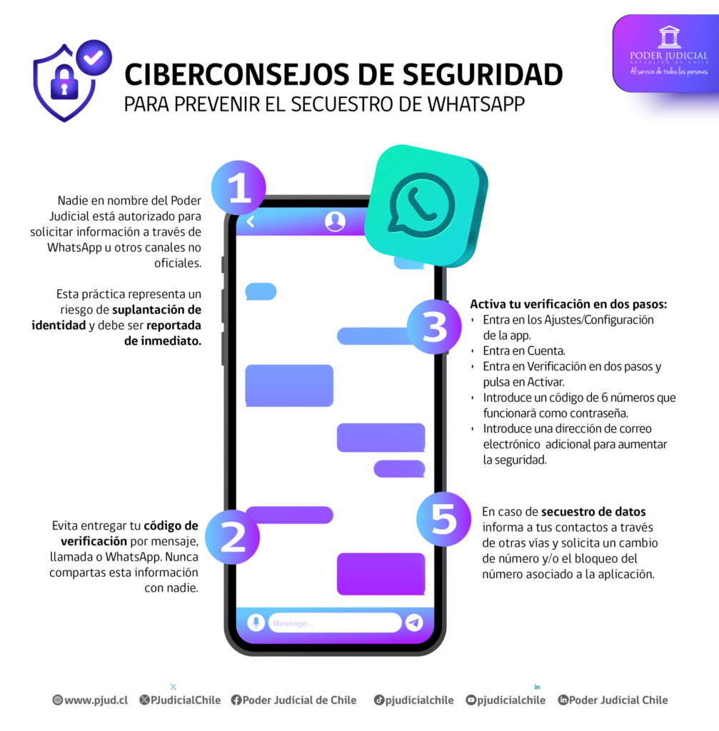 El Poder Judicial, a través de la Oficina de Seguridad y el área de Ciberiesgos de la Corporación Administrativa, reitera que se ha detectado un aumento en las denuncias internas de intentos de estafa, a través de llamados telefónicos y/o el uso de WhatsApp, de personas que suplantan la identidad de ministros (as), jueces y/o de autoridades judiciales, e incluso empresas externas, para extraer información y posteriormente, proceder con el secuestro de la aplicación o bien, solicitar pagos.