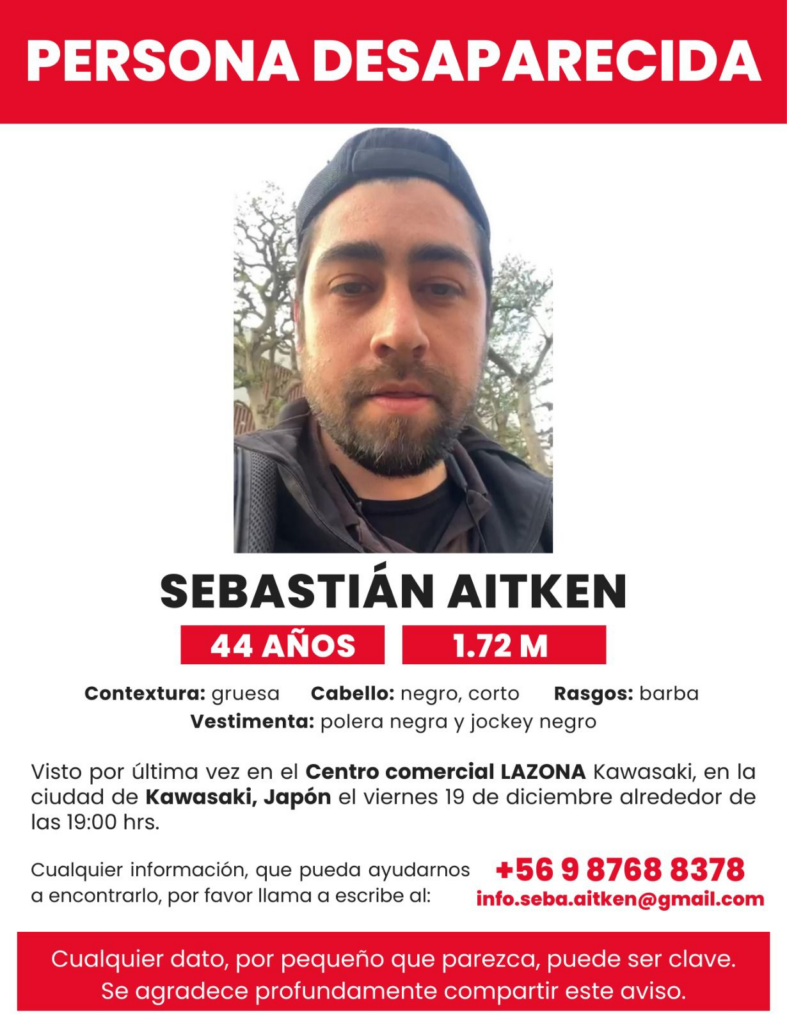 Una intensa búsqueda se desarrolla en Japón para dar con el paradero de Sebastián Aitken, ciudadano chileno con residencia en Japón desde hace más de 20 años, quien se encuentra desaparecido desde el viernes 19 de diciembre en la ciudad de Kawasaki, ubicada en el área metropolitana de Tokio.