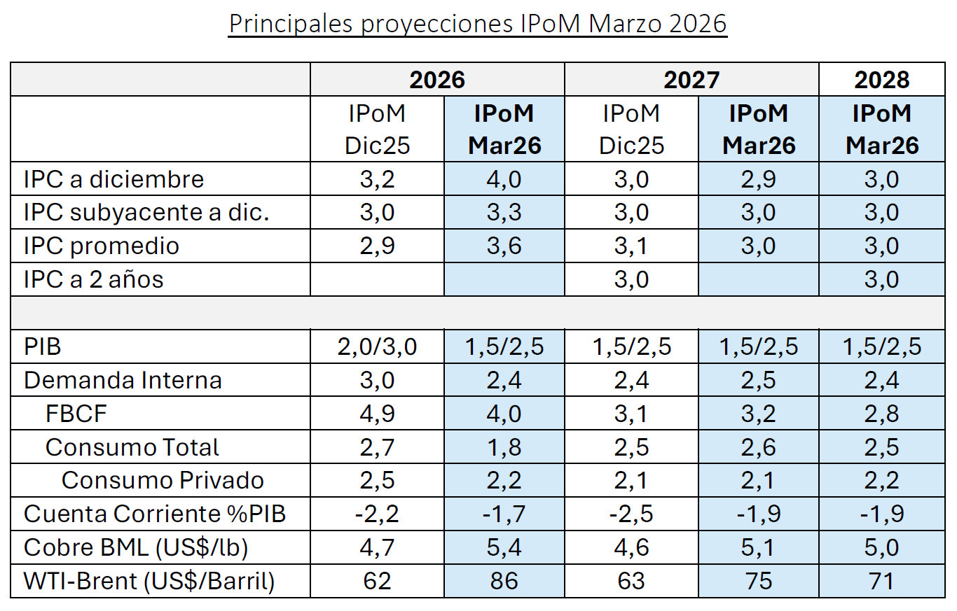 Respecto de la actividad nacional, el IPoM reduce la proyección de crecimiento para este año a un rango entre 1,5 y 2,5%, desde el 2 a 3% que se preveía en el IPoM publicado en diciembre de 2025. Esta revisión obedece a varios factores, entre ellos el cambio del escenario internacional y el desempeño más débil de la minería.