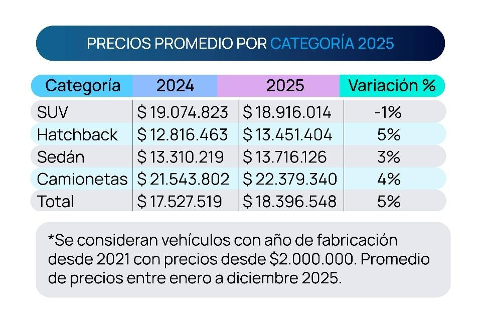 Por categoría, los hatchbacks lideraron el alza de precios, con un incremento cercano al 5%, seguidos por las camionetas con un 4%y los sedanes con un 3%. Los SUV, en contraste, fueron el único segmento que mostró una leve baja, reflejando una mayor oferta disponible frente a una demanda ya consolidada.