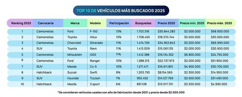 Referente al ranking de los modelos más buscados el 2025 existe una tendencia clara del mercado: las camionetas dominan la intención de búsqueda. Seis de los diez modelos pertenecen a esta carrocería y los tres primeros lugares están ocupados exclusivamente por camionetas, lideradas por Ford F-150, Toyota Hilux y Chevrolet Silverado.