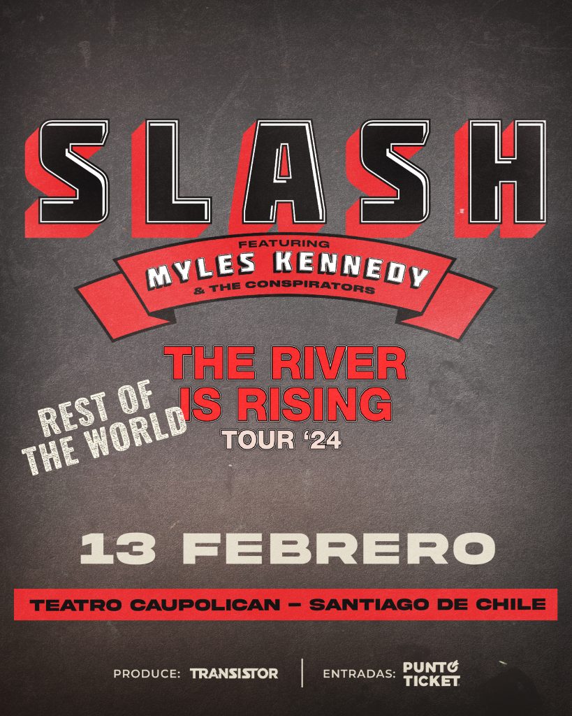Uno de los guitarristas más importantes de la historia, pisará nuevamente tierras chilenas con su gira “The River Is Rising” el próximo 13 de febrero en el Teatro Caupolicán. Slash llega con su asiduo colaborador Myles Kennedy y The Conspirators, banda que acompaña al guitarrista de Guns N’ Roses en sus trabajos solistas, siendo “4” de 2022 el más reciente de ellos. Una muestra de esta reciente placa, y otros tracks de su carrera solista, es lo que podremos disfrutar en esta nueva visita en solitario del guitarrista a nuestro país.