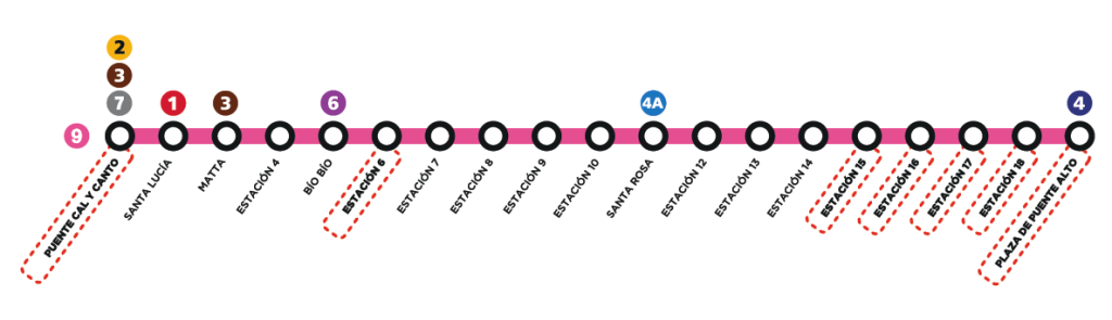 Con este cambio en el trazado, Línea 9 sumará seis combinaciones a la red de Metro: estación Puente Cal y Canto con líneas 2, 3 y 7; estación Santa Lucía con Línea 1; estación Matta con Línea 3; estación Bío Bío con Línea 6; estación Santa Rosa con Línea 4A y estación Plaza de Puente Alto con Línea 4.