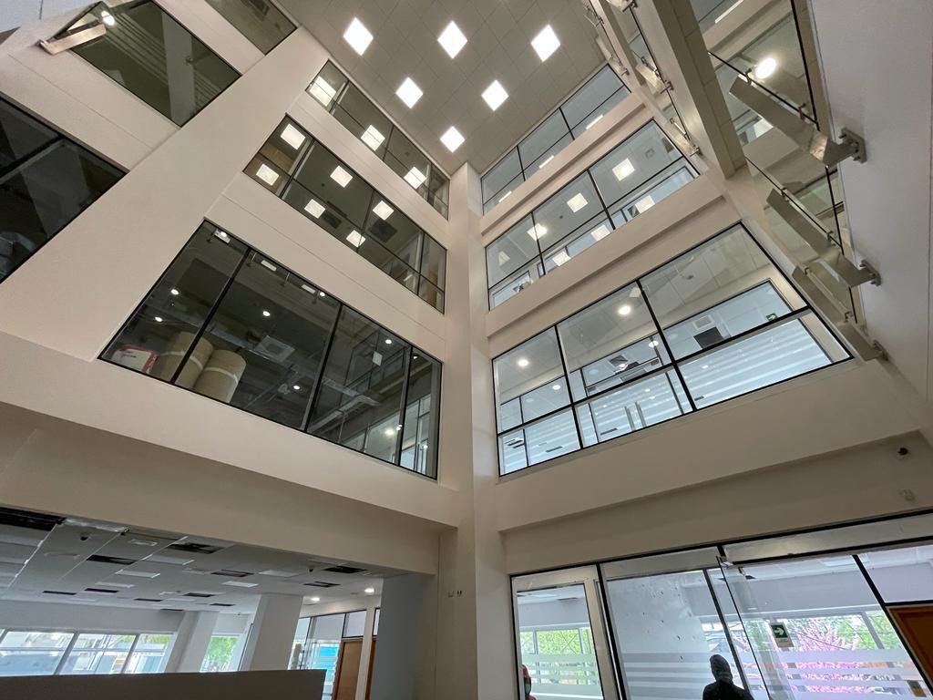 Cuenta con 7.113 metros cuadrados de superficie aproximadamente, compuesto por dos volúmenes de cuatro pisos cada uno.